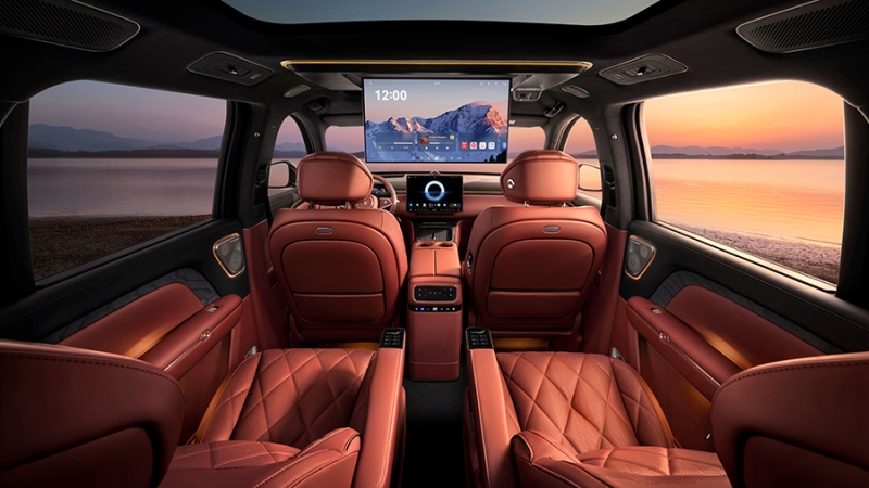 На передней панели располагается «плавающий» сенсорный экран, цифровая панель приборов, две площадки для беспроводной зарядки и отсек для хранения вещей. Также предусмотрены проекционный дисплей с дополненной реальностью, встроенный холодильник, складные столики, двухсекционная панорамная крыша и потолочный экран. Для удобства посадки/высадки есть боковые подножки с электроприводом и подсветкой, а также электроприводы и доводчики дверей.